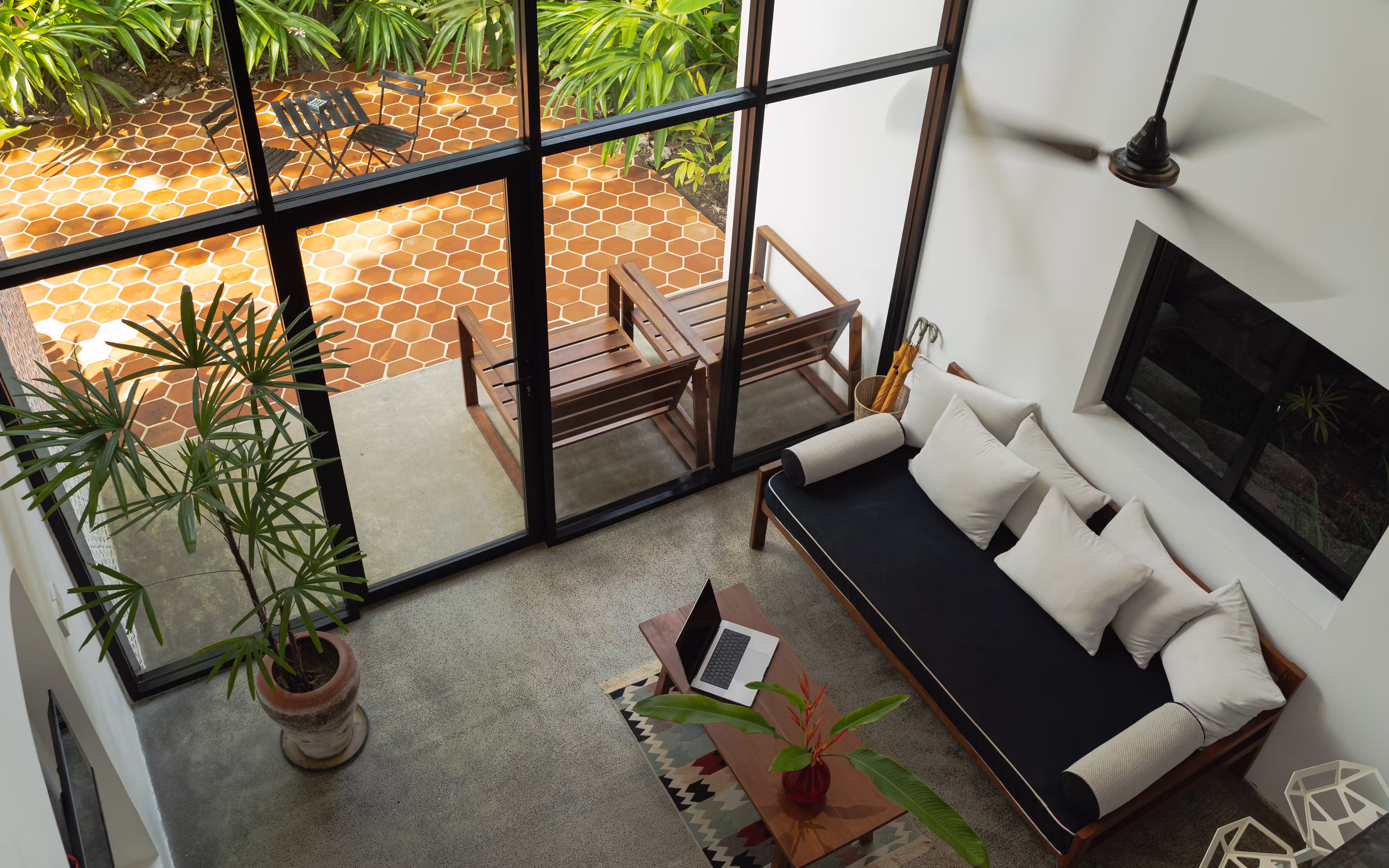 This house is the tallest and brightest with a mezzanine bedroom and no curtains or blinds. The clear glass floor to ceiling frontage provides an unobstructed view of the lush greenery, bringing nature up close and personal. The only home away from the main garden, it is an oasis on its own.